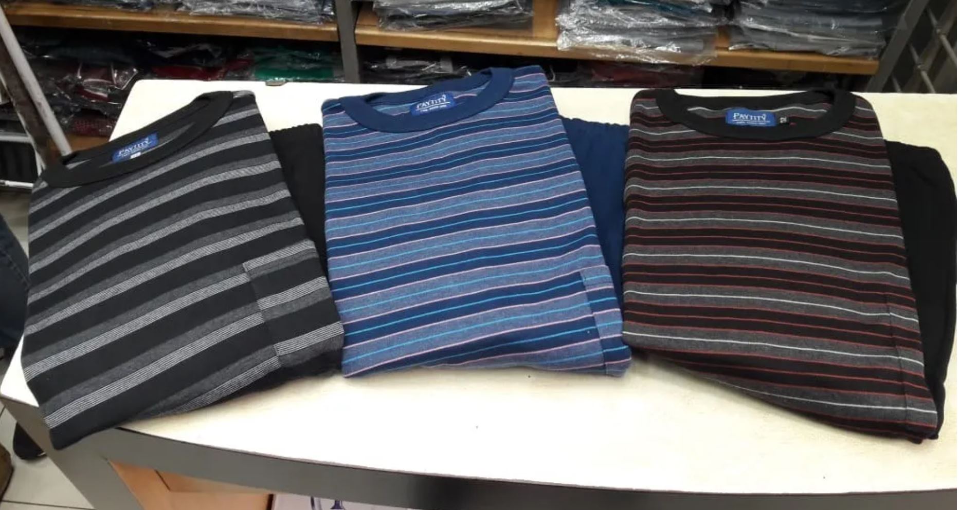 Pijama doble interlock casaca Rayada pantalón liso. Talles 46 al 54 y del 56 al 60. Colores surtidos sujetos a disponibilidad de stock. Precio variable según el talle.